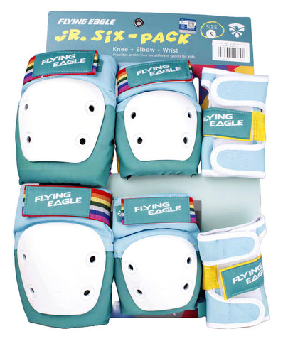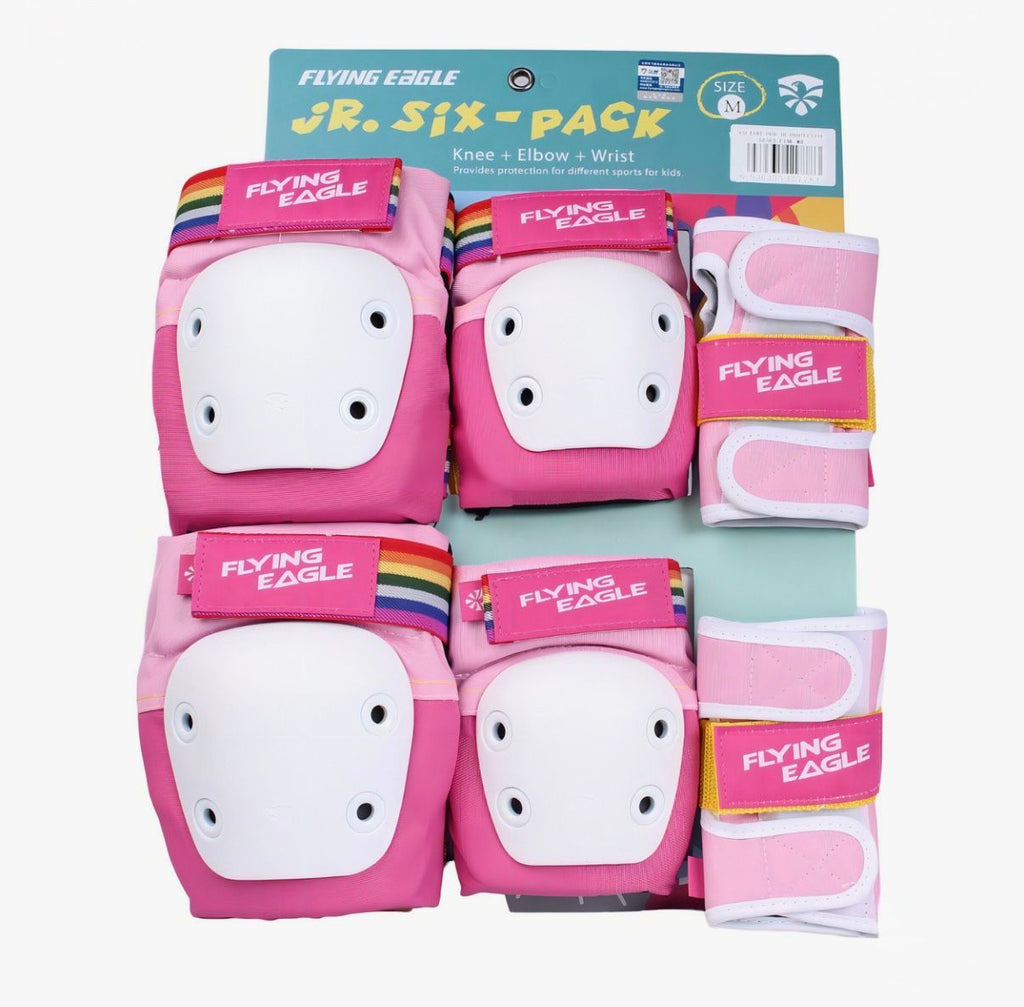 Niños protegidos mientras patinan con el Set de Protecciones Flying Eagle Valiant para Niños. Diseñado con estilo y seguridad en mente, este kit incluye rodilleras, coderas y muñequeras ajustables.